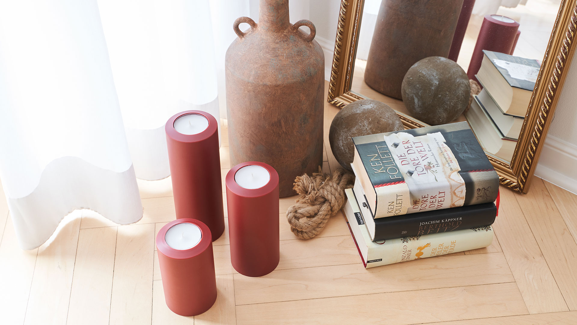 Mit ihrer geradlinigen Oberfläche fügt sich die straight-Reihe in jedes moderne Gestaltungskonzept ein und garantiert authentisches Wachskerzenfeeling für jede Kulisse. Für die Kerzenhalter werden große und kleine handelsübliche Teelichter eingesetzt.